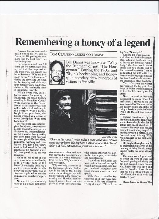 A look back at the wonderful life and times of Bill Danns aka at ‘Willy the Beeman’ or ‘The Honeyman’… He was a legend in his own time , well known and beloved for his throwback to the old ways and how he lived his life on his terms and time, off the grid in a ramshackle house in the little village of Peruville, N.Y.. Willy was best known for the honey he extracted from a set of hives that were on the hillside behind his unpainted tumbly down -at the time- oldest building in Tompkins County, still leaning but standing, at the time… built in 1797 The old Delano Hotel became Bill’s home and was filled with his life stories and remnants. People flocked from near and far to sample Willy’s flower flavors of honey and the hear his homespun stories of his life, many of which were told in snippets and were often larger than life tales that grew tall in the listeners imagination filling gaps that Willy left each person spell bound wanting to hear more. I visited Willy for many years in the 1980’s and 1990’s often taking friends out with me to meet this warmly wonderful character and spend some time in the time machine that his house had become. No running water, electricity or heating other than a portable kerosene heater in his bedroom which made winter visits an adventure of sorts but quite cozy in his deeply enchanting bedroom where he had each visitor ‘sign in’ his log book in which he kept a running record of all the many visitors he had from near and far.